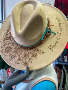 Earthy, meaningful, and beautifully detailed. This tan wide-brim hat features engraved floral artwork and the song quote: “Blame it All on my Roots,” Finished with layered leather band accents, it’s a one-of-a-kind piece made for free spirits and country music lovers