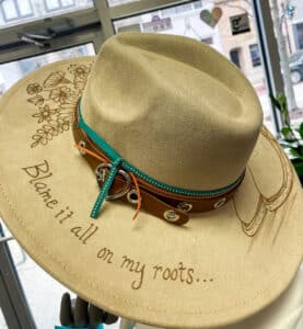 Earthy, meaningful, and beautifully detailed. This tan wide-brim hat features engraved floral artwork and the song quote: “Blame it All on my Roots,” Finished with layered leather band accents, it’s a one-of-a-kind piece made for free spirits and country music lovers