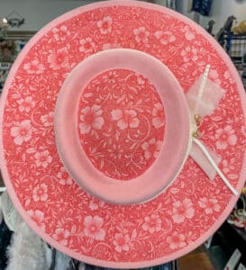 Soft, romantic, and full of charm. This blush pink wide-brim hat features an intricate floral pattern on the brim, finished with a delicate ribbon pearl accent. A true statement piece that adds elegance and femininity to any outfit