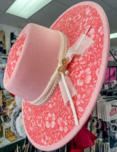 Soft, romantic, and full of charm. This blush pink wide-brim hat features an intricate floral pattern on the brim, finished with a delicate ribbon pearl accent. A true statement piece that adds elegance and femininity to any outfit